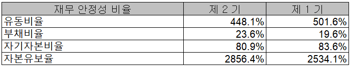 2020년 재무 안정성 비율에서는 유동비율 448.1%, 부채비율 23.6%, 자기자본비율 80.9%, 자본유보율 2,856.4%를 기록하면서 건실하고 안정적인 재무구조를 유지하고 있습니다.