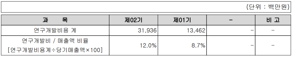 당사는 지난해 연구개발 비용으로 전체 매출액의 12%인 319억 원을 투입하면서 신규장비 및 핵심 기술과 양산 기술의 개발을 지속적으로 수행하고 있습니다.
