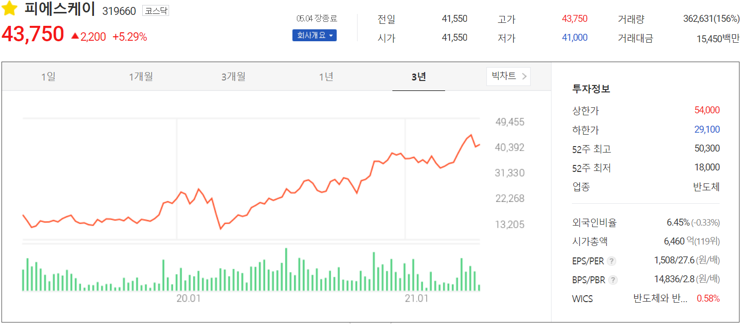 5월 4일 장 종료 기준 당사의 주가는 전일보다 5.29% 오른 43,750원에 거래를 마쳤습니다. 외국인 비중은 6.45%이며, 시가 총액 6,460억 원으로 코스닥 시총 상위 119위 종목입니다.