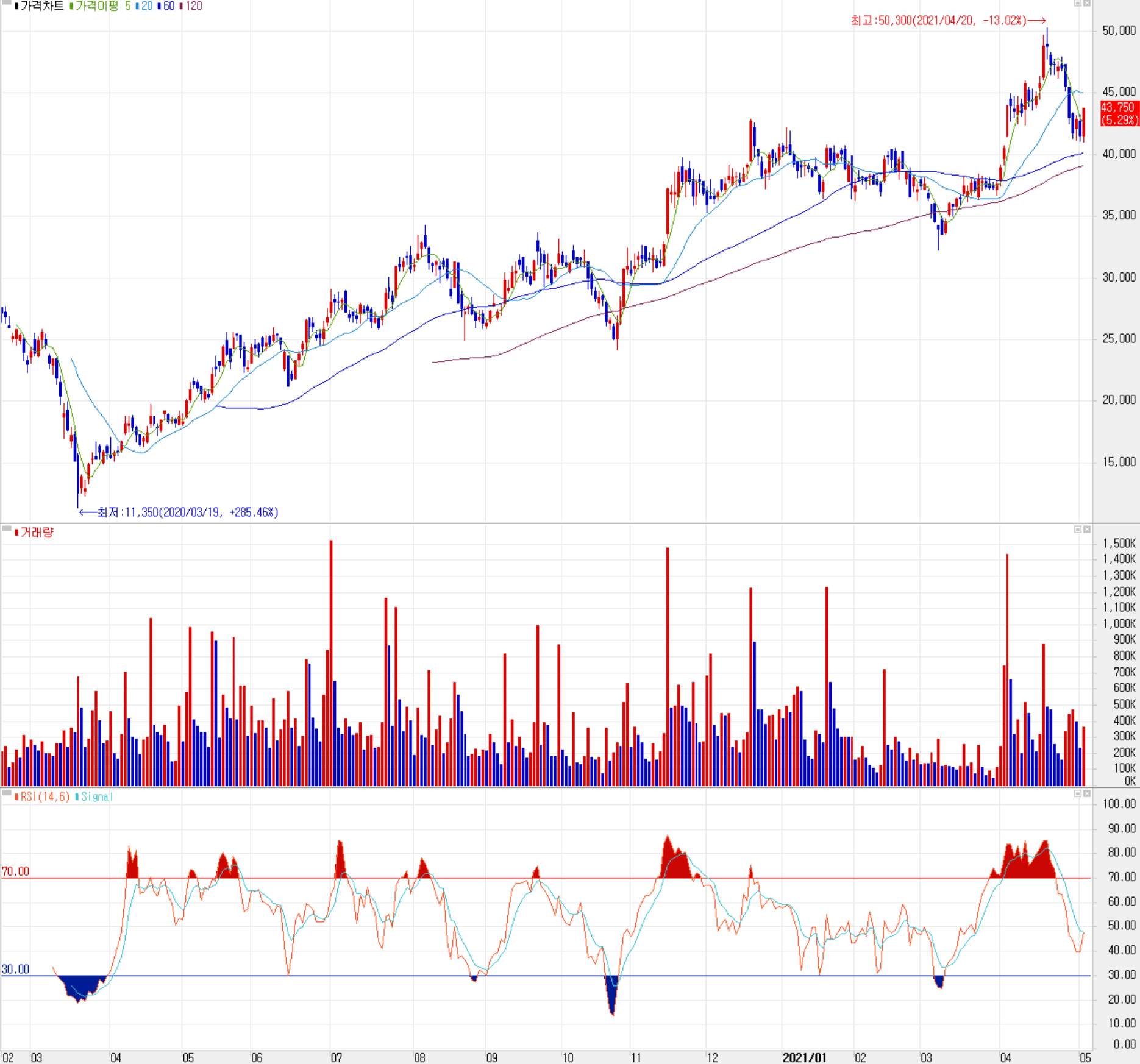 당사의 주가는 지난해 코로나19로 인한 급락 이후 꾸준한 우상향을 보이고 있습니다. 지난해 말부터 올해 초반 40,000원 근처에서 횡보하다가 30,000원 중반까지 하락했으나 외국인 수요가 증가하면서 4월 20일 최고가인 50,300원을 기록한 후 조정을 받는 모습입니다. 최근 수급에서는 연기금을 위주로 한 기관의 매수세가 우위를 보이고 있으며, 외국인은 매도하고 있습니다. 예상 실적과 차트 소견으로 종합한 개인적인 목표주가는 52,000원으로 설정하였습니다.