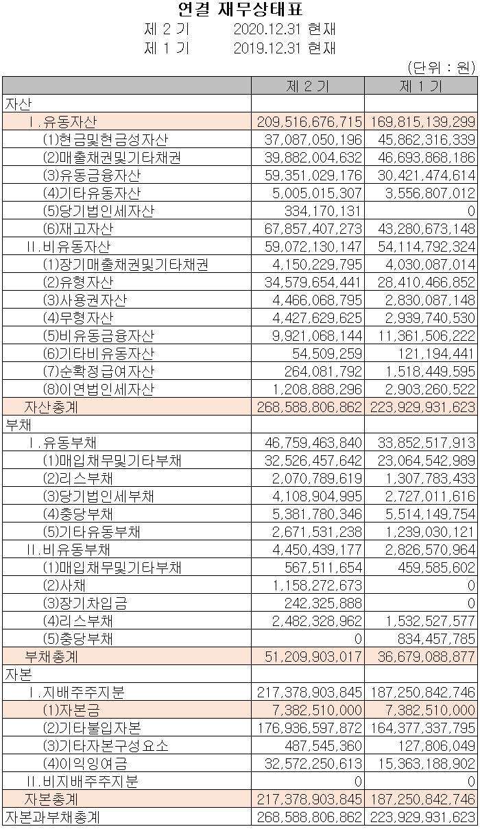 2020년 당기 말 자산총계는 전년 대비 19.9%(447억 원) 증가한 2,686억 원으로 유동 금융자산 및 유형자산의 증가가 주된 요인입니다. 부채는 39.6%(145억 원) 증가한 512억 원으로 매입채무 및 리스 부채가 주요 증가 요인입니다. 당기 순이익의 증가로 자기자본이 전년보다 301억 원 증가한 2,174억 원입니다.