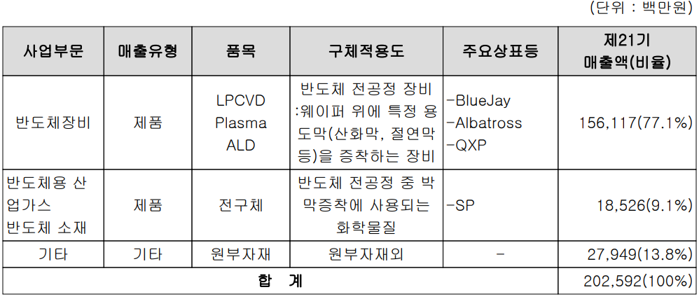 당사의 사업부문은 반도체 전공정에 해당하는 증착 공정용 장비인 CVD, ALD 등을 제조하는 반도체 장비 사업부문과 박막 증착에 사용되는 소재인 전구체를 제조하는 반도체 소재 사업부문으로 구성되어 있습니다.