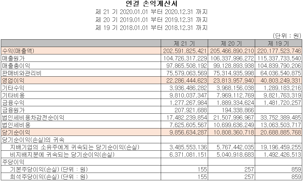 당사의 2020년 실적은 매출액 2,026억 원으로 전년 대비 1.4% 감소했고, 영업이익은 223억 원으로 6.4% 감소, 당기순이익은 8.8% 감소한 99억 원으로 기록했습니다. 코로나19의 영향 속에서도 수출이 증가하면서 전기 대비 유사한 성과를 기록한 것으로 보입니다.