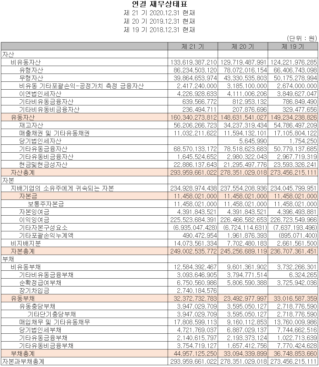 2020년 당기 말 자산총계는 전년 대비 5.6%(156억 원) 증가한 2,940억 원으로 유형자산 및 재고자산의 증가에 기인한 것입니다. 부채는 35.8%(119억 원) 증가한 450억 원으로 차입금 조달과 매입채무에 대한 증가가 있었습니다.