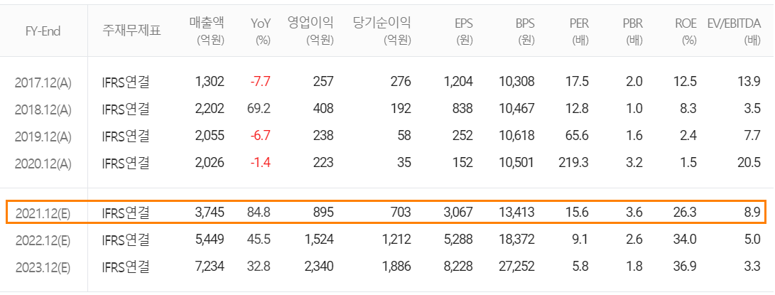 유진테크의 2021년 예상 실적은 매출액 3,745억 원으로 전년 대비 84.8% 증가하고, 영업이익은 895억 원으로 201.3% 증가, 당기순이익은 703억 원으로 1,908.6% 증가할 것으로 추정했습니다. 당사의 독보적인 배치 ALD와 전구체 등이 반도체 슈퍼사이클의 도래에 따른 성장과 겹치면서 2023년까지 매년 사상 최대 실적 갱신을 예상하고 있습니다.
