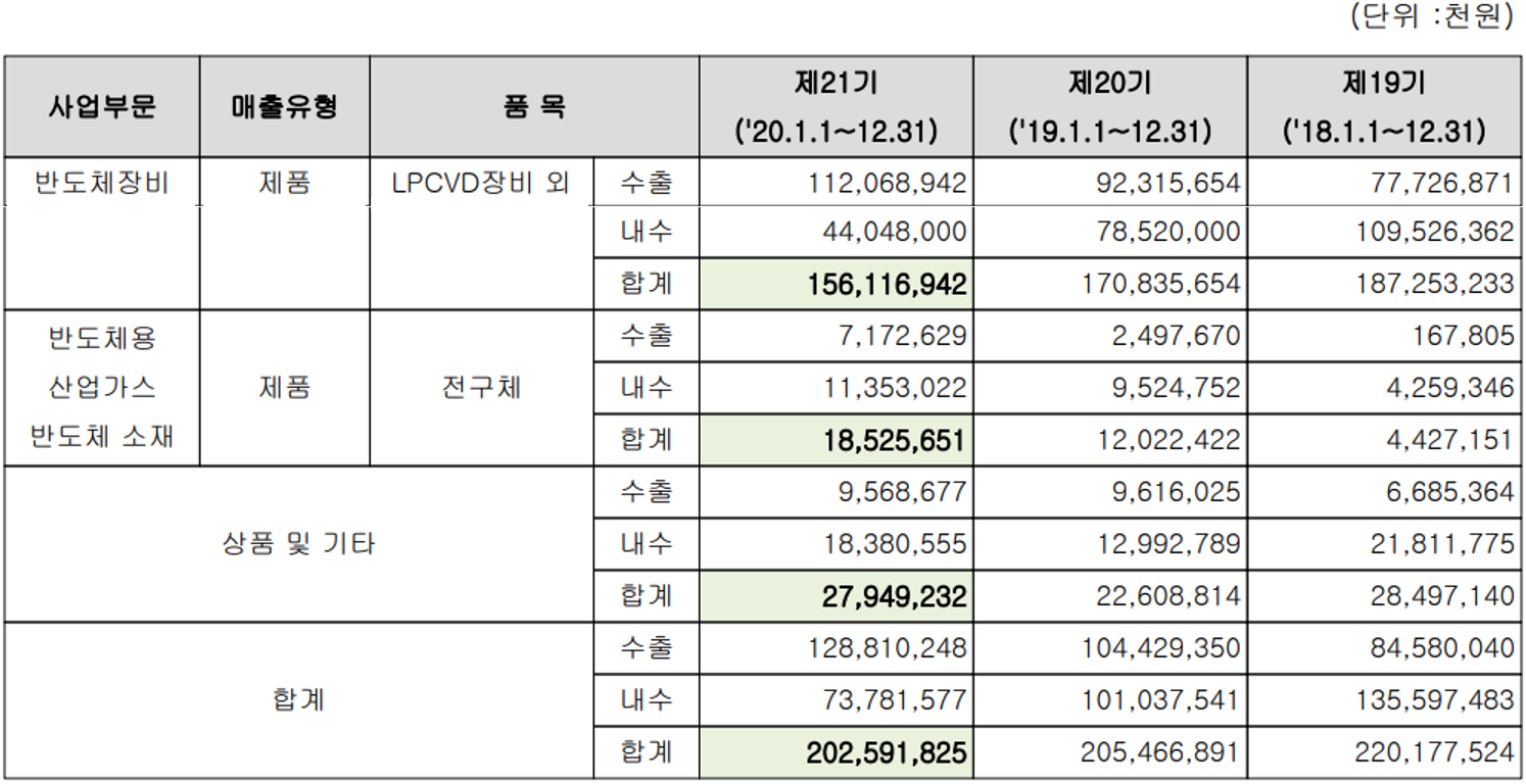 당사의 사업부문은 반도체 전공정에 해당하는 증착 공정용 장비인 CVD, ALD 등을 제조하는 반도체 장비 사업부문과 박막 증착에 사용되는 소재인 전구체를 제조하는 반도체 소재 사업부문으로 구성되어 있습니다.