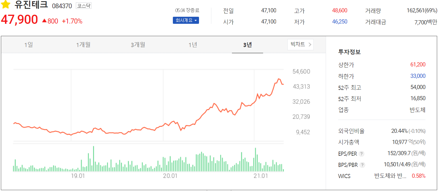 반도체 장비 관련주 중에서 2021년이 가장 기대되는 종목 중 하나인 유진테크입니다. 기업 개요 Profile 회 사 명 (주)유진테크 설 립 일 2000.01.05 대표 이사 엄평용 임직원 수 233명 (2020.09) 주소 경기