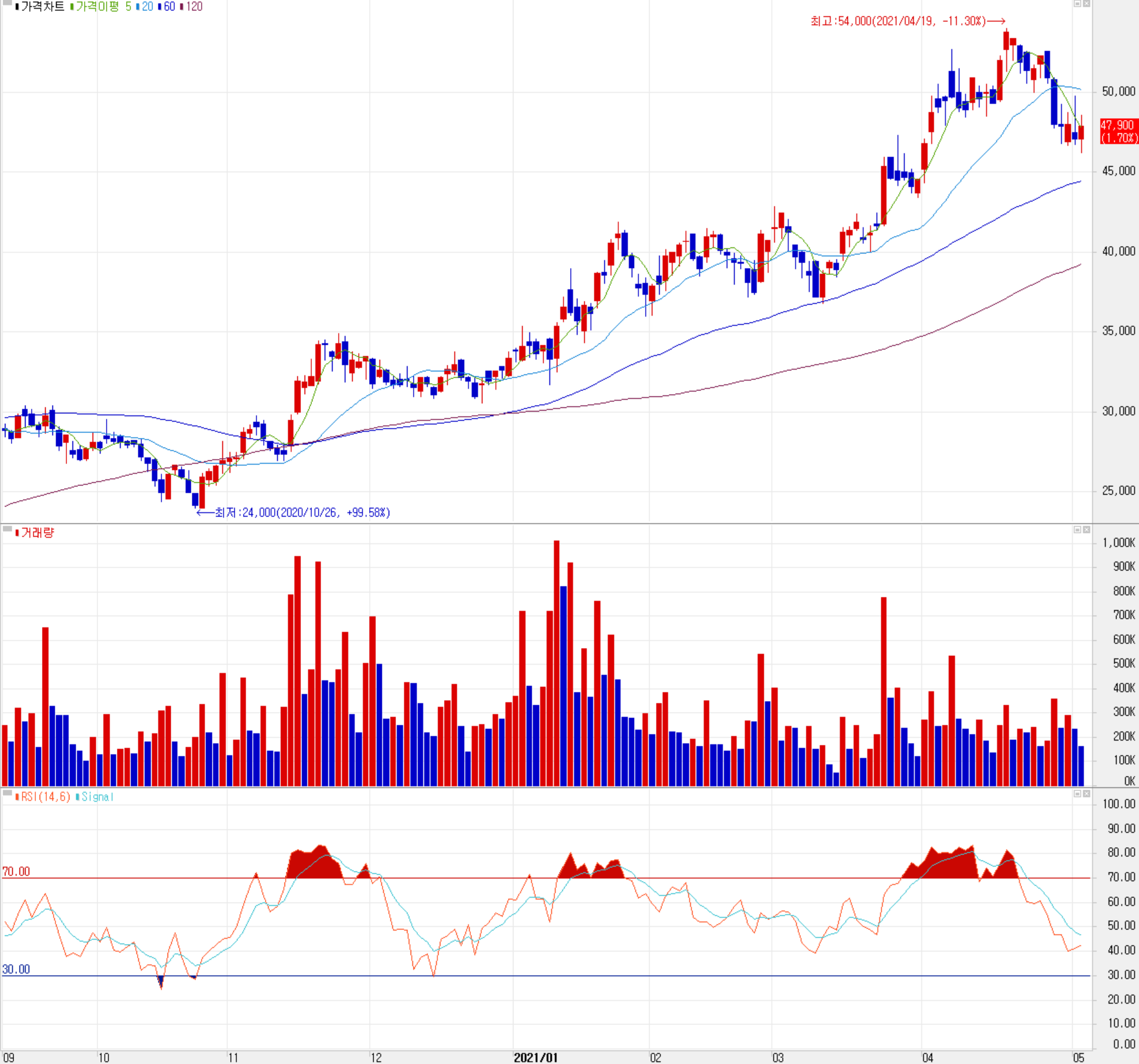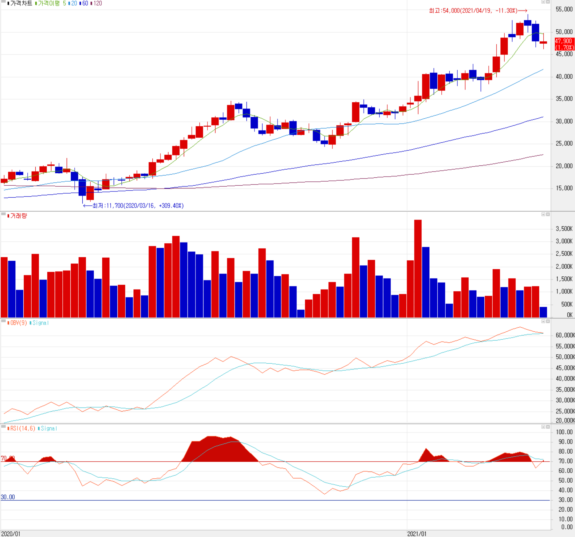 지난 2020년부터 현재까지 당사의 주가는 코로나19 팬데믹 쇼크로 인한 3월과 10월 잠시 조정을 받은 것 외에는 지속적으로 우상향을 보여주고 있습니다. 지난 4월 19일 최고점인 54,000원 이후 조정을 받고 있으나 최근 3 거래일 동안 47,000원 부근에서 움직이고 있습니다. 최근 한 달간 수급 주체들 간의 공방이 치열한 가운데 개인이 매수 우위를 보이고 있습니다. 예상 실적과 차트 소견을 종합한 개인적인 목표주가는 58,000원으로 설정하였고, 추가 조정 시에는 44,000원에서 지지가 예상됩니다.