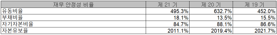 당사의 2020년 재무 안정성 비율에서는 유동비율 495.3%, 부채비율 18.1%, 자기자본비율 84.7%, 자본유보율 2,011.1%를 기록하면서 건실하고 안정적인 재무상태를 유지하고 있습니다.