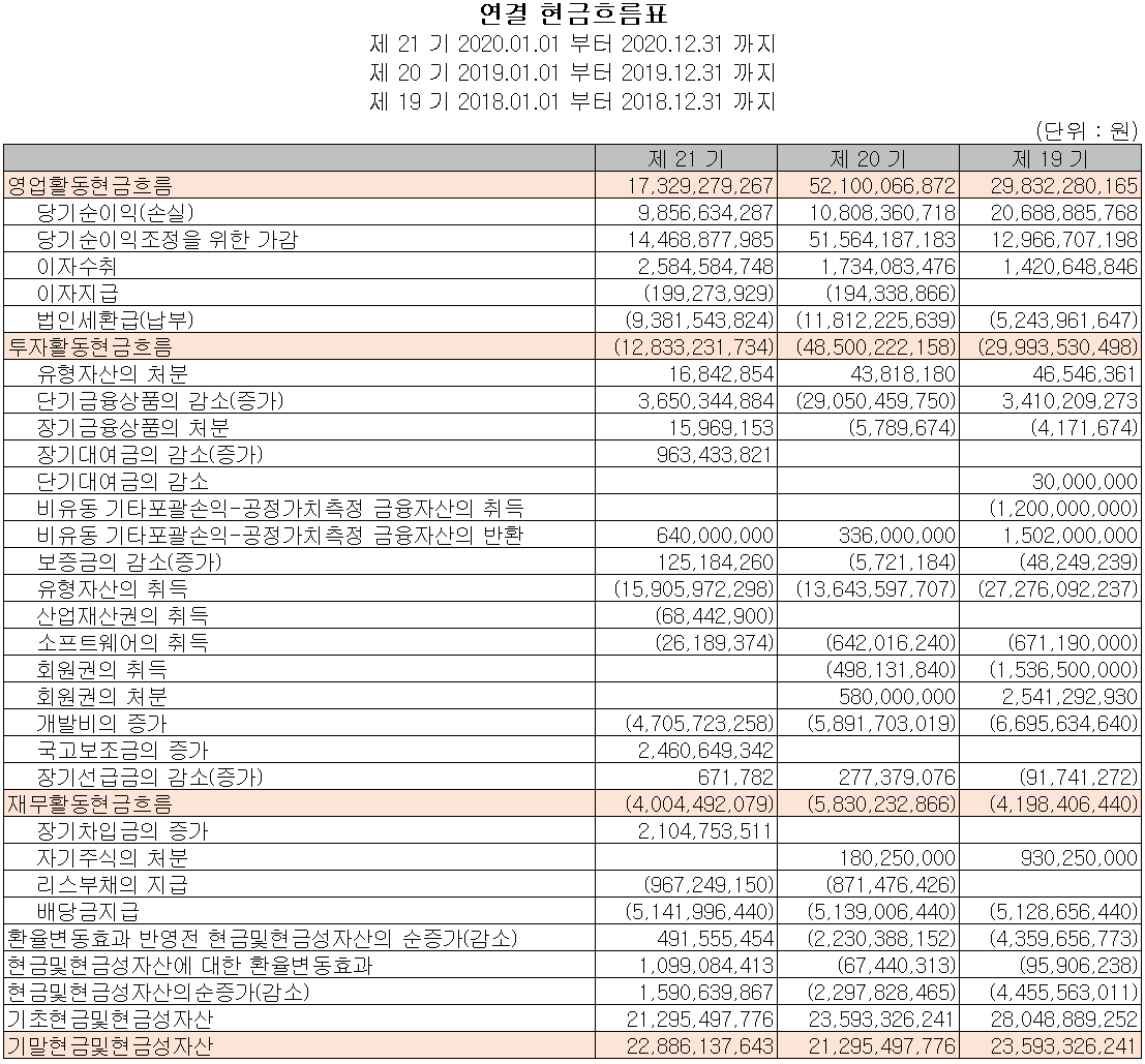 지난해 영업활동 현금흐름은 전기보다 348억 원이 감소한 173억 원이 유입되었으며, 차입금을 조달하여 부채를 상환하고 배당금을 지급했습니다. 또한 유무형 자산에 대한 투자를 지속하고 있습니다. 2020년 당기말 기준 당사의 현금 및 현금성 자산은 전년 대비 16억 원이 증가한 229억 원입니다.
