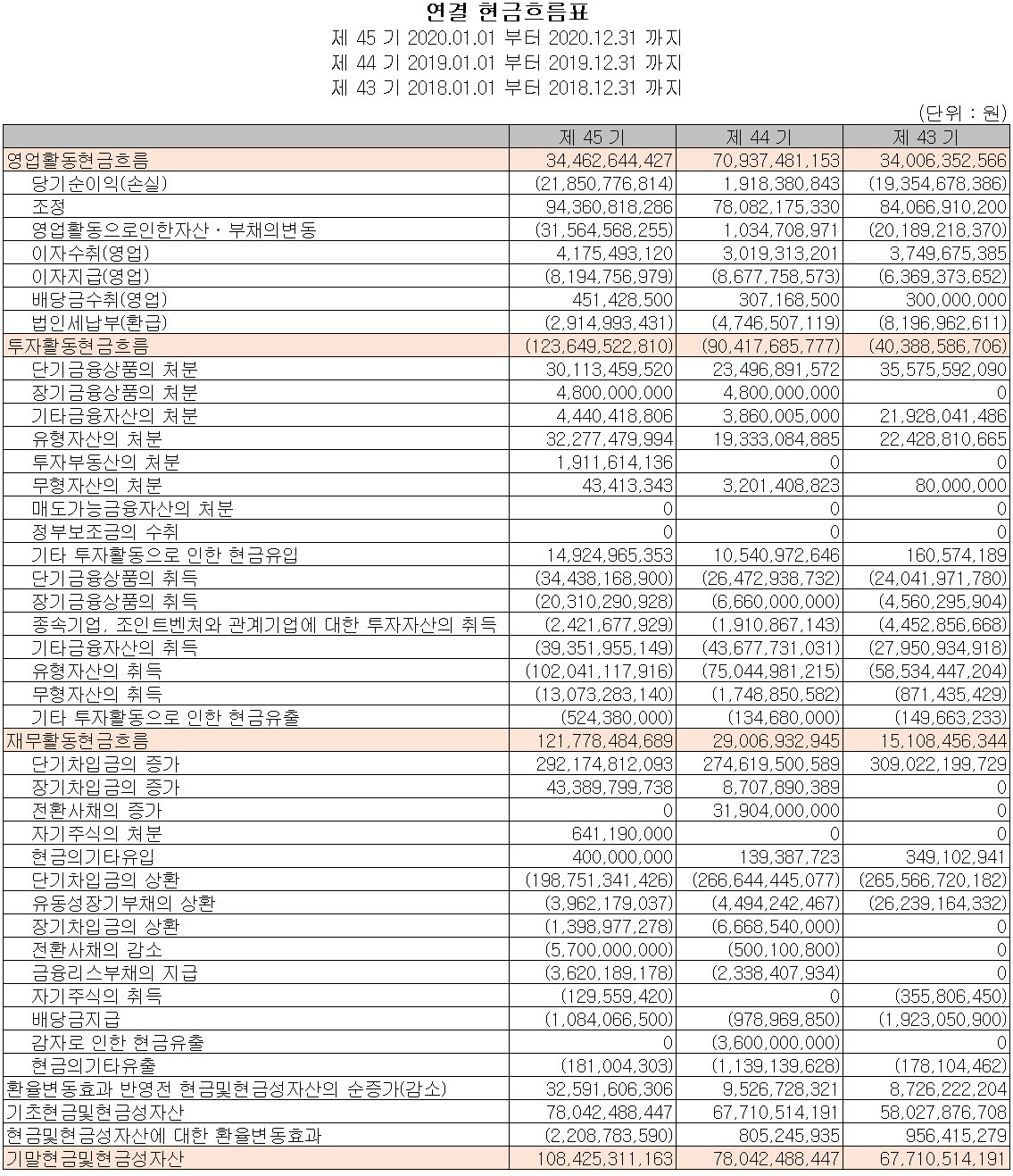 영업활동 현금흐름에서는 당기순손실을 기록하면서 전년 대비 365억 원 감소한 345억 원의 현금이 유입되었습니다. 장단기 차입금을 조달하여 부채를 상환하고, 배당금을 지급하였습니다. 친환경 차량용 부품 사업 등으로 유무형 자산에 투자하면서 투자활동 현금흐름에서는 1,236억 원이 유출되었습니다. 2020년 당기 말 기준 당사의 현금 및 현금성 자산 규모는 1,084억 원입니다.