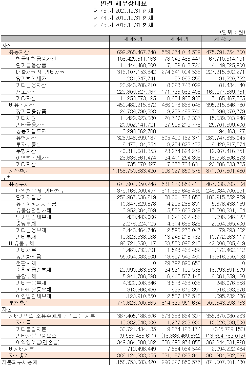 2020년 당기 말 자산총계는 전년 대비 16.3%(1,627억 원)이 증가한 1조 1,588억 원으로 현금 및 현금성 자산, 매출채권, 재고자산 등의 증가가 주된 증가요인입니다. 부채는 25.3%(1,558억 원) 증가한 7,706억 원으로 매입채무의 증가 및 차입금 조달로 인한 증가입니다.
