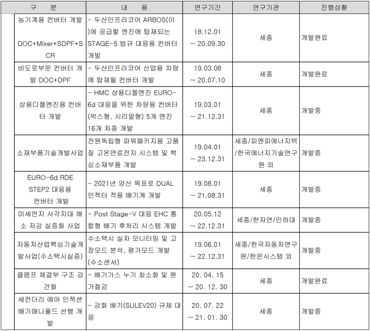 당사는 현재 산업용 차량의 컨버터 개발, 연료전지 시스템, 배기가스 시스템, 수소 택시 실증 사업 개발 및 선행 개발 등을 수행하고 있습니다.
