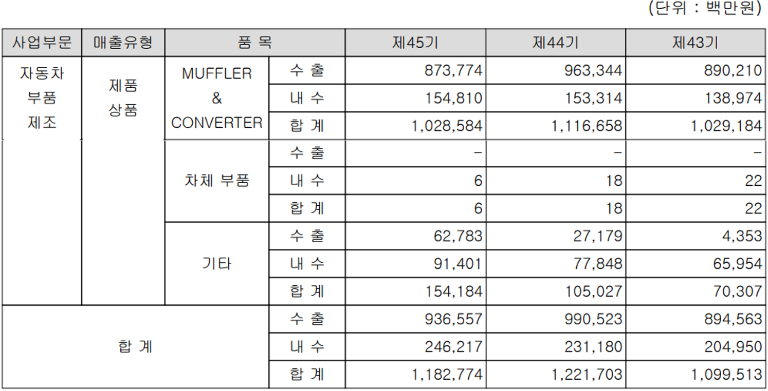 당사는 자동차 부품 단일 사업부문으로 기존 내연기관 자동차의 소음기, 정화기 등 배기가스 시스템, 차체 부품, 수소차 및 스마트 카의 핵심 부품을 제조하는 전장부품 등으로 구성되어 있습니다. 지난해 소음기 및 배기가스 정화기의 매출은 전체 매출의 86.96%를 차지하였고, 전장부품 매출이 13.03%의 매출 비중을 나타냈습니다.