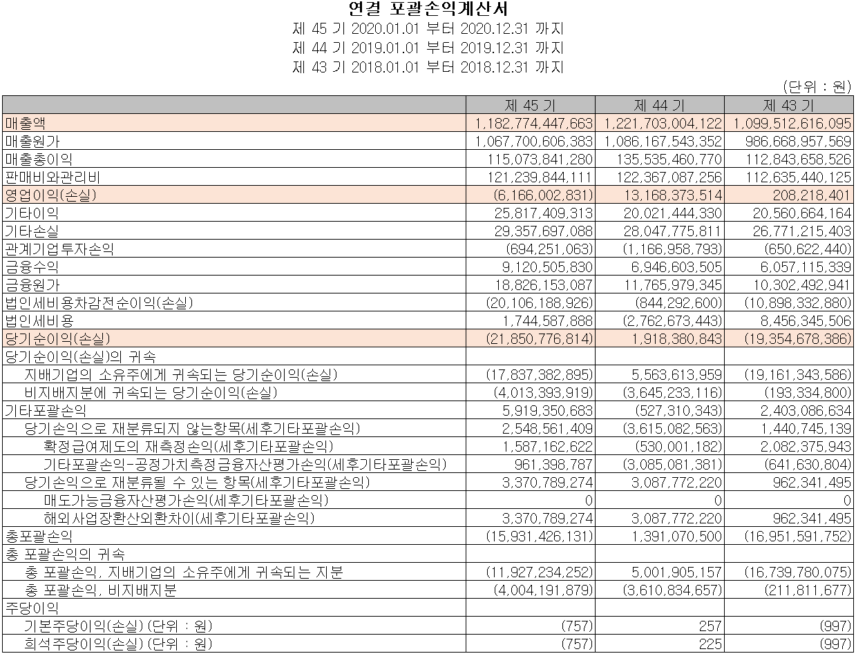 당사의 2020년 실적은 매출액 1조 1,828억 원으로 전년 대비 3.2% 감소했고, 영업손실 62억 원, 당기순손실 219억 원으로 적자 전환했습니다. 코로나19의 영향에도 매출액은 비교적 선방했으나, 환율 변동에 따른 외환차손의 발생으로 적자를 기록했습니다.