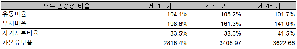 2020년 당사의 재무 안정성 비율은 유동비율 104.1%, 부채비율 198.6%, 자기자본비율 33.5%, 자본유보율 2,816.4%를 기록하였습니다. 코로나19로 인한 실적 악화 등으로 부채비율이 증가 추세에 있으며, 유동성이 부족한 상황을 나타내고 있습니다.