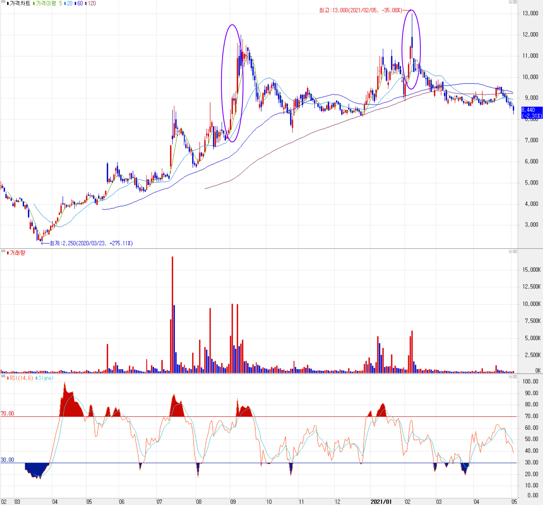 지난해 3월 코로나19로 급락한 이후 빠르게 반등한 주가는 9월까지 정부의 그린 뉴딜 정책 중 수소차 관련주로 분류되면서 큰 상승을 이어 가다가 조정을 받았고 지난 2월 최고가인 13,000원을 달성한 이후 시장 수급 변동에 따른 조정을 받다가 최근 들어서는 대부분의 자동차 부품 종목들이 투자자들의 관심에서 소외되는 것 같습니다. 차량용 반도체 수급 부족에 따른 생산 차질 등의 여파에 따른 것으로 생각됩니다. 반도체 수급 상황을 모니터링하면서 저점 매수할 시기로 봐도 좋을 것 같습니다. 단기적으로는 8 거래일 연속 하락세를 보이고 거래량도 둔화된 상태라서 개인적인 목표주가는 10,500원으로 설정하였으나, 좀 더 관망하면서 추가 하락 시 7,600원 선을 지지하는지 보고 접근할 생각입니다.