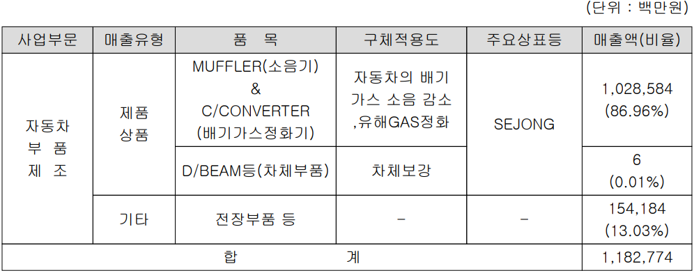 당사는 자동차 부품 단일 사업부문으로 기존 내연기관 자동차의 소음기, 정화기 등 배기가스 시스템, 차체 부품, 수소차 및 스마트 카의 핵심 부품을 제조하는 전장부품 등으로 구성되어 있습니다. 지난해 소음기 및 배기가스 정화기의 매출은 전체 매출의 86.96%를 차지하였고, 전장부품 매출이 13.03%의 매출 비중을 나타냈습니다.