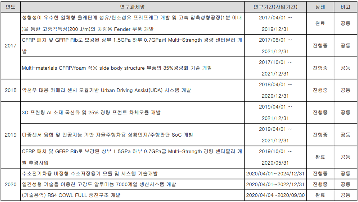 당사는 지난해 전체 매출액의 3.34%에 해당한느 88억 원규모의 연구개발 비용을 투입하면서 올레핀, 탄소섬유 등의 소재를 응용한 부품 경량화, 차량용 카메라 센서, 자율주행 솔루션, 수소차용 수소저장용기 모듈 및 시스템 개발 등을 수행하고 있습니다.