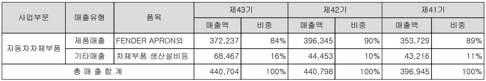 당사는 자동차 부품 단일 사업부문으로 차체에 해당하는 펜더, 도어 모듈, 패널 등을 제조하는 차체 부문과 전기차, 수소차 등 친환경 차량의 전장 부품 그리고 AVMR 등의 제품으로 구분됩니다. 지난해 당사의 차체 부품 매출은 전체 매출의 84%를 차지하였고, 기타 차체부품 생산설비가 16%의 매출 비중을 보였습니다.