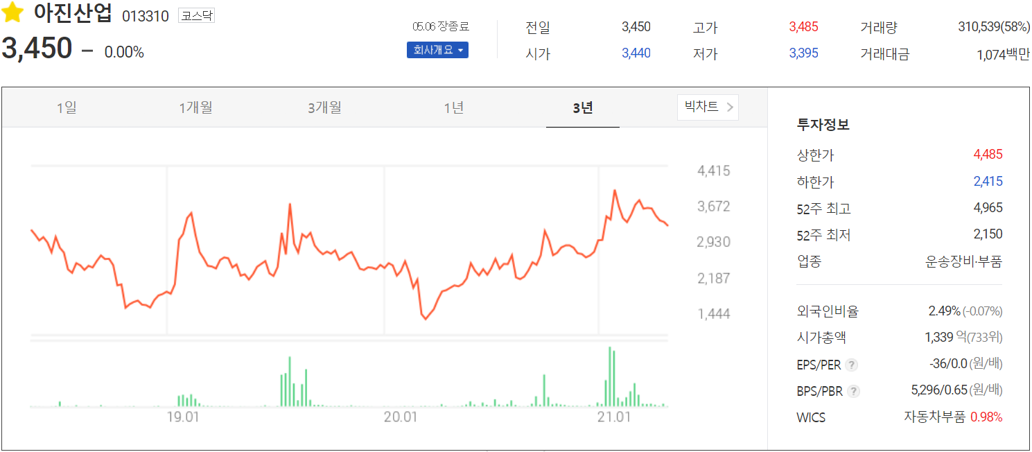 5월 6일 장종료 기준 당사의 주가는 3,450원에 거래를 마감했습니다. 외국인 비중은 2.49%이며, 시가 총액 1,339억 원으로 코스닥 시총 상위 733위 종목입니다.
