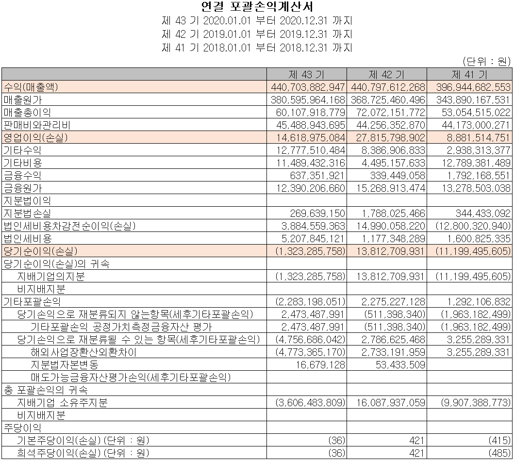 당사의 2020년 실적은 매출액 4,407억 원으로 전년 대비 0.02% 감소했고, 영업이익은 146억 원으로 47.44% 감소, 당기순손실 13억 원을 기록하면서 적자 전환했습니다. 내수 실적이 증가하면서 매출은 전기와 유사한 실적을 거두었으나, 수출이 감소하면서 전기와 비슷한 수준의 매출을 보였고 50%가 넘는 수출의 영향으로 환율 변동에 따른 환차손이 발생하여 적자 전환했습니다.