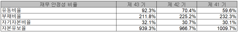 당사의 재무 안정성 비율에서는 유동비율 92.3%, 부채비율 211.8%, 자기자본비율 32.1%, 자본유보율 939.3%를 기록하였습니다. 비교적 부채비율이 높지만 감소 추세에 있으며, 유동비율이 증가하고 있어 긍정적 요소로 판단됩니다.