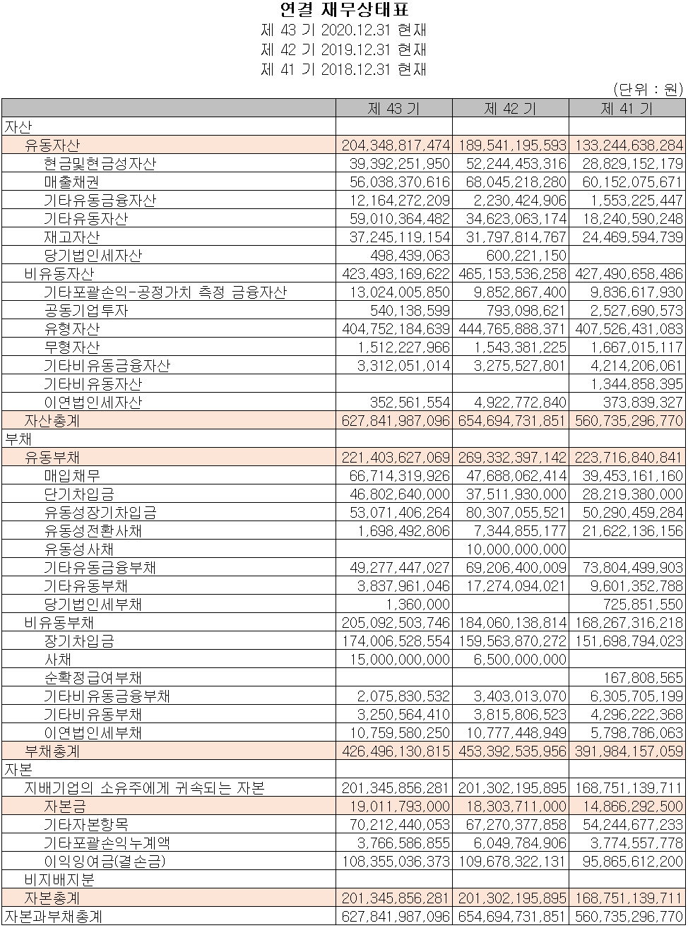 2020년 당기 말 기준 자산 총계는 4.1%(269억 원) 감소한 6,278억 원으로 유동자산 중 현금 및 예금의 감소와 매출채권 등의 감소에 기인합니다. 부채는 5.9%(269억 원) 감소한 4,265억 원으로 차입금과 사채 등 비유동 부채는 증가하였고, 매입채무, 단기 차입금도 증가하였으나 유동성 장기차입금이 감소하면서 전반적인 부채 감소가 있었습니다.