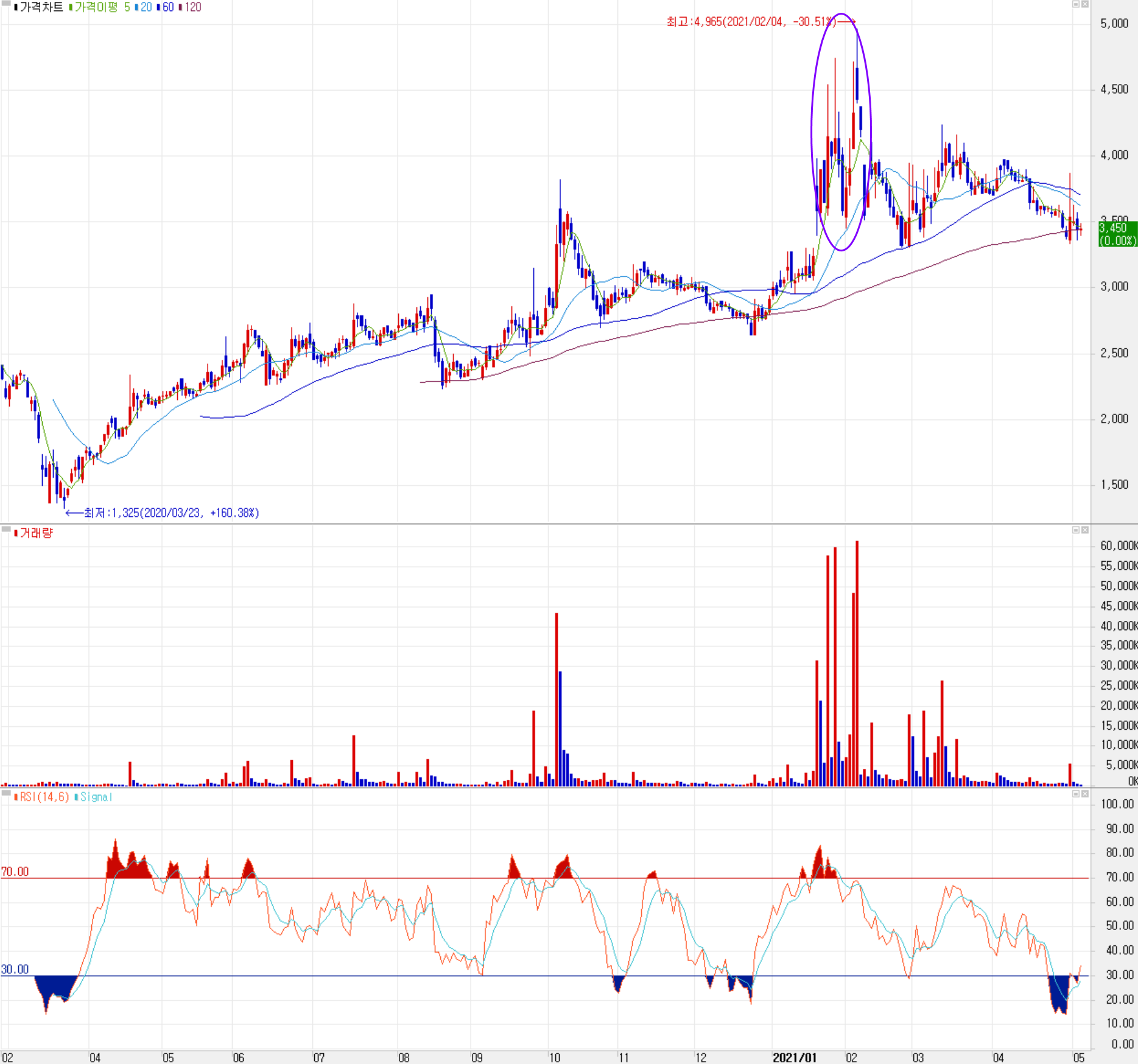 지난해 3월 코로나19 팬데믹으로 급락했던 주가는 빠르게 회복 후 두 차례 급등이 나오면서 완만한 상승세를 보이고 있으나 최근 차량용 반도체 이슈로 전반적인 자동차 부품 주들에 대한 투자자들의 관심이 멀어진 듯합니다. 최근 수급에서는 기관의 거래는 거의 없고, 외국인과 개인의 공방 속에 개인이 소폭 매수 우위를 유지하고 있습니다. 차트 소견으로 개인적인 목표주가는 4,100원으로 설정하였고, 상승 시 3,700원 부근에서 저항이 예상됩니다.