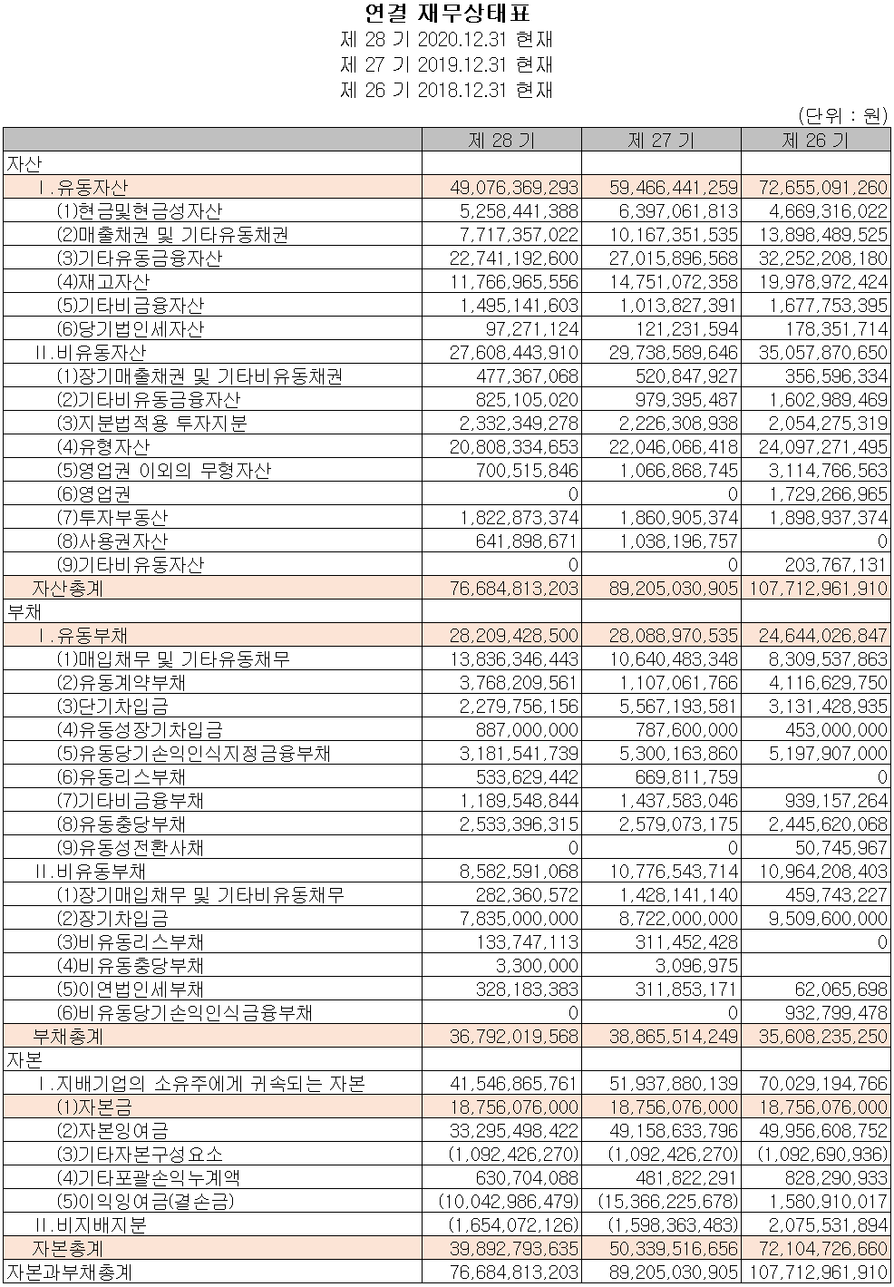 2020년 당기 말 자산총계는 전년 대비 14%(125억 원) 감소한 767억 원으로 현금성 자산, 매출 채권, 재고자산 및 기타금융자산의 감소가 있었습니다. 부채는 전기 대비 5.3%(20억 원) 감소한 368억 원으로 장단기 차입금의 감소에 기인합니다. 자본총계는 당기순손실로 인해 20.8% 감소하여 399억 원을 기록했습니다.