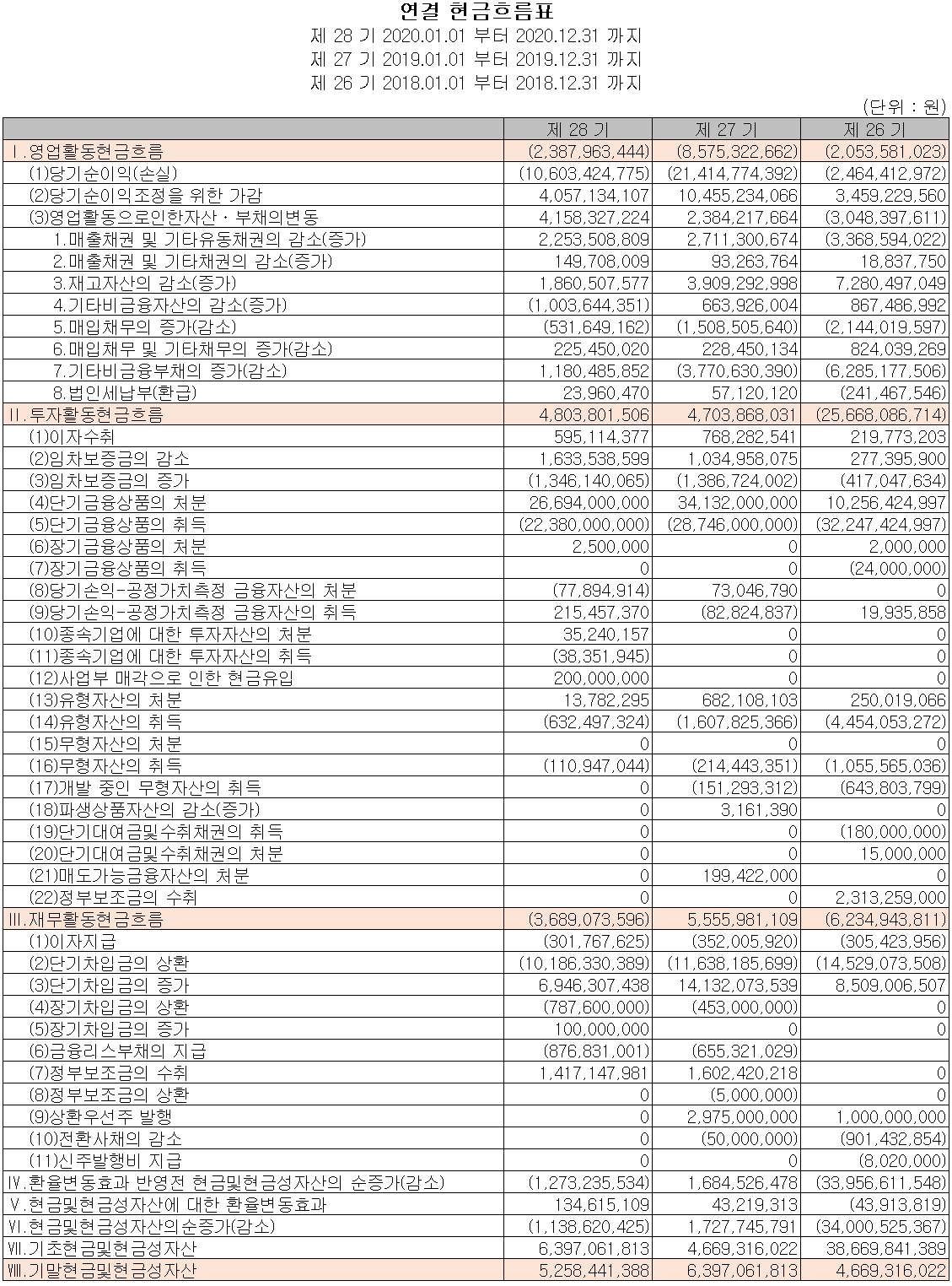영업활동 현금흐름에서는 손실 규모가 줄어들면서 전기 대비 62억 원의 현금유출이 줄어들면서 24억 원의 현금이 유출되었습니다. 장단기 차입금으로 자금을 조달하였고, 정부 보조금(14억 원)을 수취하여 부채의 상환 및 연구 개발 등을 수행하였습니다.