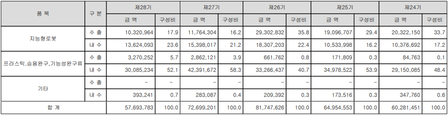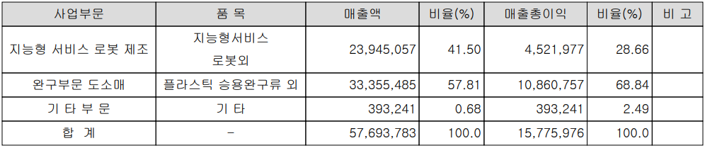 당사의 사업은 자율주행, 스마트 팩토리, 물류로봇 등을 제조하는 지능형 서비스 로봇부문과 종속회사 (주)지나월드를 통한 완구부문의 도소매 업으로 구성되어 있습니다. 지난해 지능형 서비스 로봇 부문의 매출은 전체 매출의 28.66%이며, 완구부문 매출은 68.84%의 비중을 나타냈습니다. 당사는 2020년 10월 22일 이사회 결의를 통하여 (주)지나월드를 매각하기로 결정하였으며, 당기 중 매각을 완료했습니다.