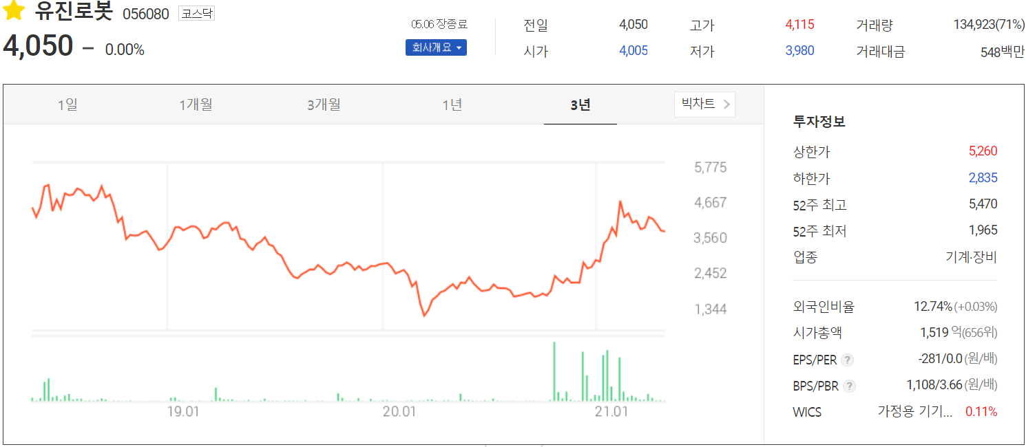 5월 6일 장 종료 기준 당사의 주가는 4,050원에 마감되었습니다. 외국인 비중은 12.74%이며, 시가 총액 1,519억 원으로 코스닥 시총 상위 656위 종목입니다.