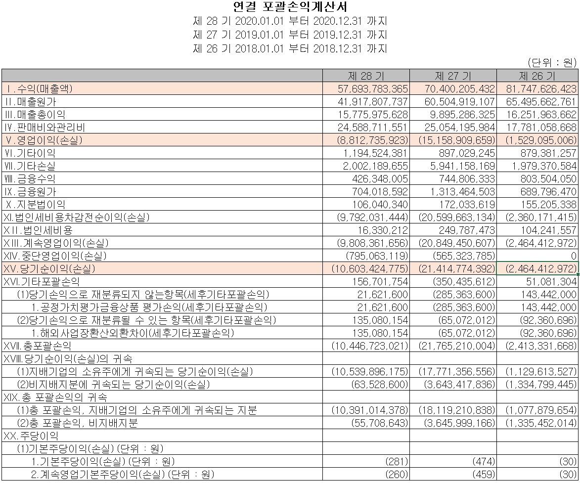 당사의 2020년 실적은 매출액 577억 원으로 전년 대비 18% 감소했고, 영업손실 88억 원, 당기순손실 106억 원으로 적자 지속입니다. 별도 기준으로는 매출액은 246억 원, 영업손실 88억 원, 당기순손실 102억 원을 기록하였습니다. 완구사업 부문에서도 코로나19로 인한 매출 감소와 국제회계기준에 의한 매출 순액 조정으로 인해 매출의 감소가 있었으나, 상품 및 제품 이익률 개선과 판매관리비의 절감을 통하여 영업손실과 당기순손실이 감소하였습니다.