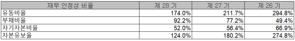 당사의 2020년 재무 안정성 비율에서는 유동비율 174%, 부채비율 92.2%, 자기자본비율 52%, 자본유보율 124%를 기록하였습니다. 유동성은 어느 정도 안정적이라고 평가할 수 있으나 감소 추세에 있고, 부채비율이 증가 추세에 있습니다. 올해는 완구사업 부문을 매각하고 로봇 사업 단일 부문만 운영을 하면서 해외 고객사 다변화 등을 위한 노력을 하는 것으로 알려졌습니다.