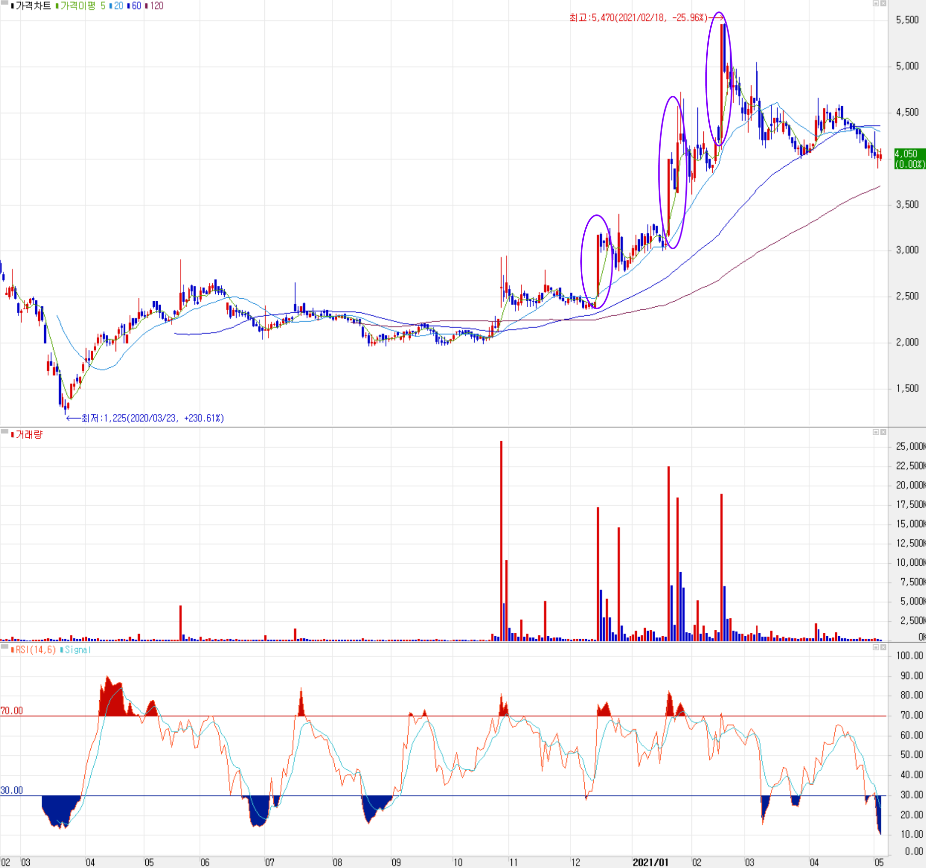 지난해 3월 코로나19로 급락한 이후 일부 회복했으나 연결 기준 적자가 지속되는 상황에서 주가도 1년 여 기간 동안 하락세를 보였으나, 지난해 12월에는 2025년까지 로봇 시장이 연평균 32% 성장한다는 소식에 올랐고, 1월에는 애플카 테마로 2월에는 당사의 자율주행 로봇이 해외 시장에 진출한다는 소식에 급등했습니다. 최근 한 달간 수급에서는 기관의 움직임은 거의 없는 가운데 외국인과 개인의 공방이 이어지고 있으며, 외국인이 소폭 매수 우위를 보이고 있습니다. 차트 소견상 개인적인 목표주가는 5,000원에 설정하였고, 하락 시 3,700원 선을 지지로 보고 있습니다.