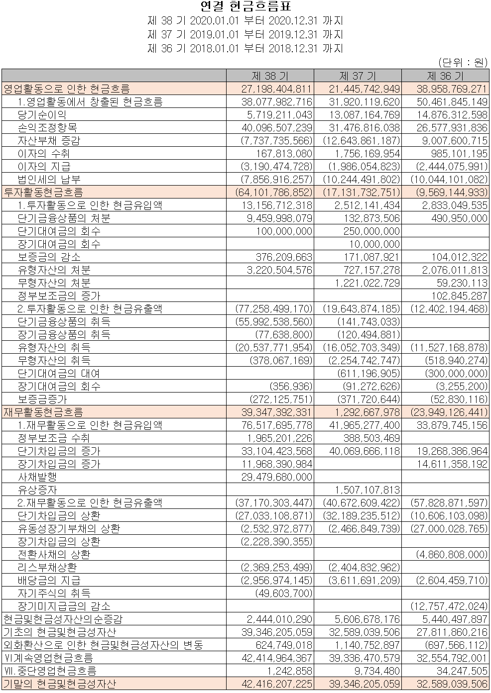 지난해 영업활동으로 인한 현금흐름은 전기 대비 58억 원 늘어난 272억 원의 현금이 유입되었습니다. 투자활동에서는 금융상품의 취득 및 유무형 자산의 취득으로 총 641억 원의 현금이 유출되었으며, 장단기 차입금의 조달 및 정부 보조금으로 연구개발에 대한 투자와 부채를 상환하였고, 배당금을 지급하였습니다. 2020년 당기 말 기준 당사의 현금 및 현금성 자산은 424억 원입니다.