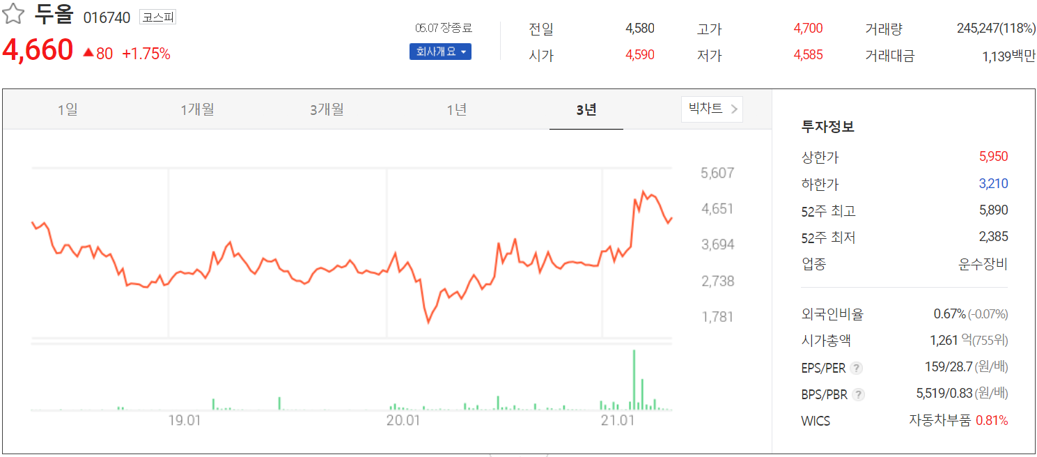 5월 7일 장 종료 기준 당사의 주가는 전일보다 1.75% 오른 4,660원에 거래를 마쳤습니다. 외국인 비중은 0.67%이며 시가총액 1,261억 원으로 코스피 시총 상위 755위 종목입니다.