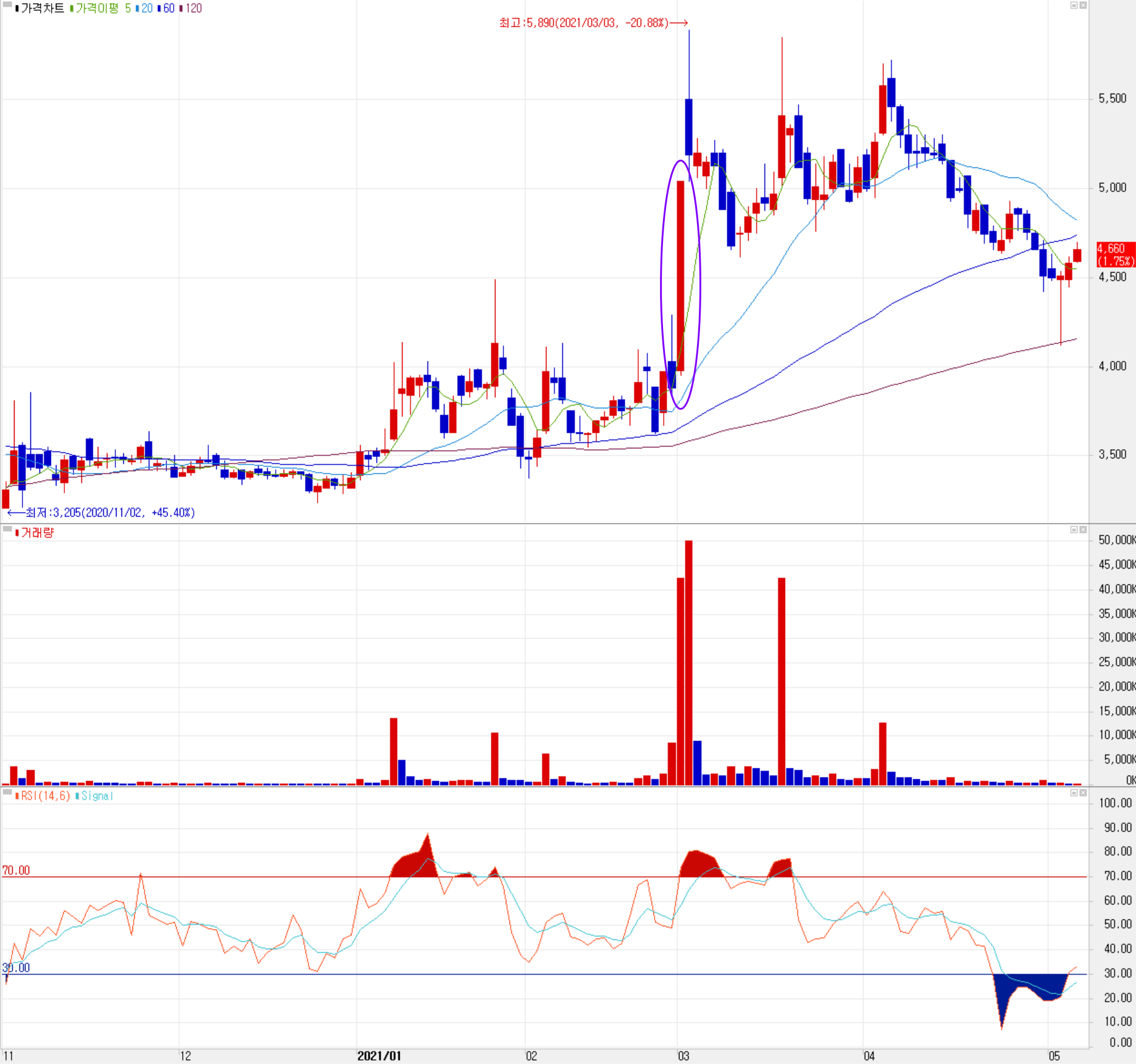 지난해 11월, 12월 3,500원 부근에서 횡보하던 주가는 올해 1월 들어서면서 3,500 ~ 4,000원 사이 박스권 횡보를 거듭하다가 3월에는 주고객사인 현대자동차의 전기차 아이오닉 5 수혜주로 급등했습니다. 이후 변동폭을 키우다 4월 들어서면서 차량용 반도체 수급 부족으로 인한 생산 차질 여파로 주가가 하락하면서 4,500원 선을 유지하고 있습니다. 최근 수급에서는 기관이 소극적인 가운데 개인과 외국인이 매수 우위를 보이면서 공방을 지속하는 상황입니다. 차트 소견으로 개인적인 단기 목표주가는 5,400원이며, 4,900원 부근에서 저항이 예상됩니다. 단기적으로 다가오는 1분기 실적과 현대차 제네시스, 아이오닉 소식을 모니터링하면서, 중기적으로는 차량용 반도체 수급 문제를 검토하면서 목표주가를 점검할 필요가 있습니다.