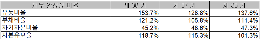 당사의 2020년 재무 안정성 비율에서는 유동비율 153.7%, 부채비율 121.2%, 자기자본비율 45.2%, 자본유보율 118.7%를 기록하였습니다. 자본유보율이 비교적 낮은 편이고, 부채비율이 높아졌으나 전반적으로 양호한 재무상태로 보입니다.