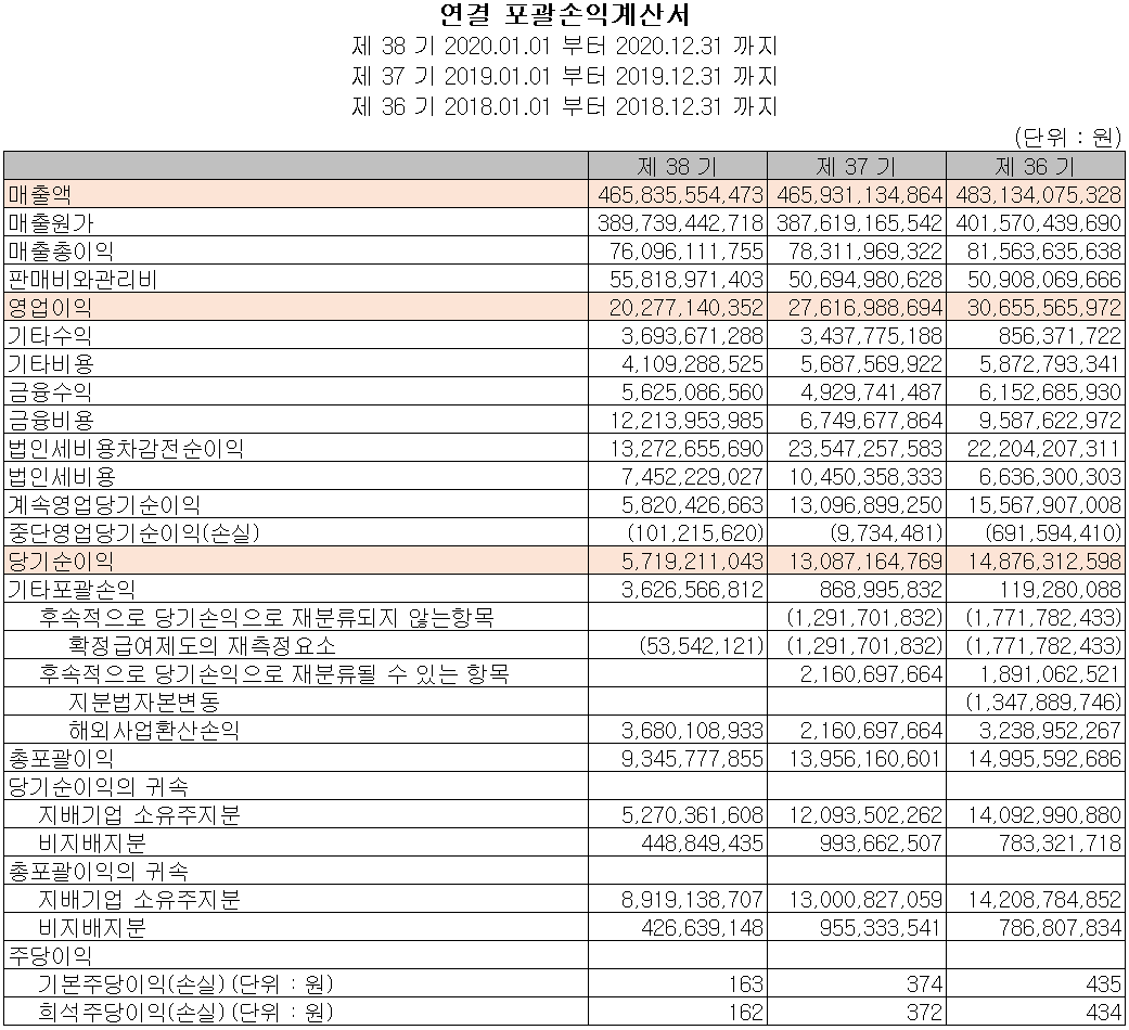 당사의 2020년 실적은 매출액 4,658억 원으로 전기 대비 0.02% 감소하면서 비슷한 규모의 실적을 올렸고, 영업이익은 203억 원으로 26.58% 감소, 당기순이익 57억 원으로 56.3% 감소하였습니다. 주로 코로나19로 인한 봉쇄조치 등으로 해외법인의 실적이 부진했고, 환율 변동에 따른 외환차손으로 손익규모가 감소하였습니다.