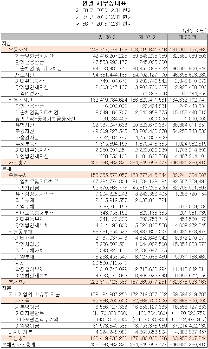 2020년 당기 말 자산총계는 전년 대비 11.4% 증가한 4,057억 원으로 현금 및 현금성자산과 금융상품의 증가가 주된 요인입니다. 부채는 18.7% 증가한 2,223억 원으로 장단기 차입금의 증가에 기인합니다.
