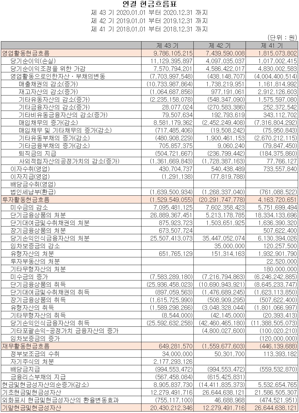 지난해 영업활동으로 인한 현금흐름은 전기 대비 23억 원이 증가한 98억 원의 현금이 유입되었습니다. 주요 증가요인은 실적 개선에 따른 당기순이익의 증가에 있습니다. 자기 주식(21억 원)을 처분하고, 정부 보조금을 수취하였으며 무차입 경영을 유지하면서 리스 부채를 상환하고 배당금을 지급했습니다. 2020년 당기말 기준 현금 및 현금성 자산은 전기 대비 82억 원 증가한 204억 원입니다.