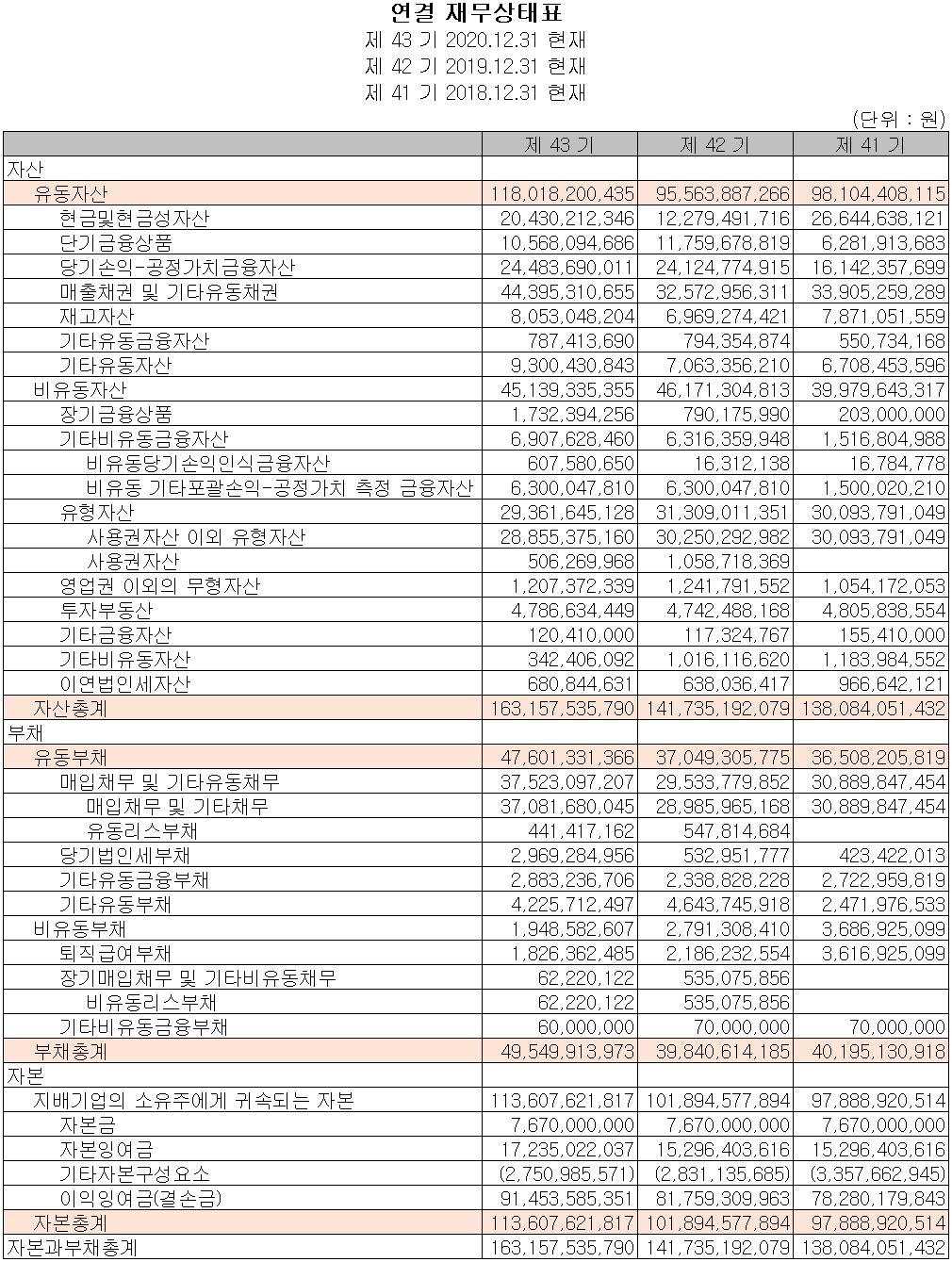 2020년 당기 말 기준 자산총계는 전년 대비 15.1%(214억 원) 증가한 1,632억 원으로 실적 개선에 따른 현금 및 현금성 자산과 매출 채권으 증가에 기인합니다. 부채는 24.4%(97억 원) 증가한 495억 원으로 매출 증가에 따른 매입 채무가 증가했습니다. 자본총계는 이익잉여금의 증가에 따라 전기 대비 11.5% 늘어난 1,136억 원을 기록했습니다.