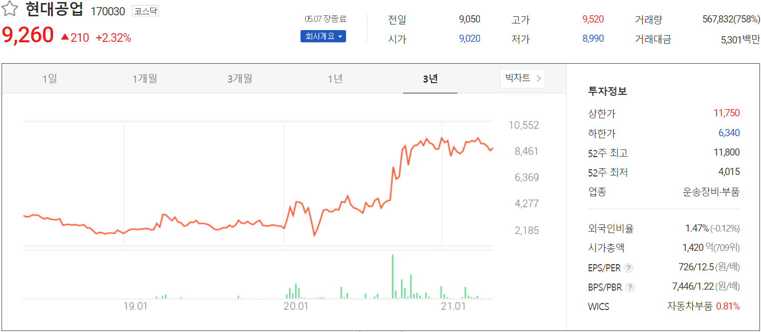 5월 7일 당사의 주가는 전일보다 2.32% 오른 9,260원에 거래를 마쳤습니다. 외국인 비중은 1.47%이며, 시가 총액 1,420억 원으로 코스닥 시총 상위 709위 종목입니다.