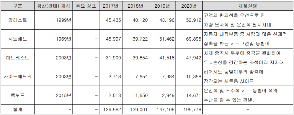 당사는 합성수지 발포 성형 기술 등을 통한 자동차의 암레스트, 시트패드, 헤드레스트 및 백보드 등을 제조, 공급하고 있습니다. 지난해 암레스트 매출은 전체 매출의 27%를 차지하였고, 시트패드 35.7%, 헤드레스트 24.5%, 사이드 패드 5.3%, 백보드 7.5%의 매출 비중을 나타냈습니다.