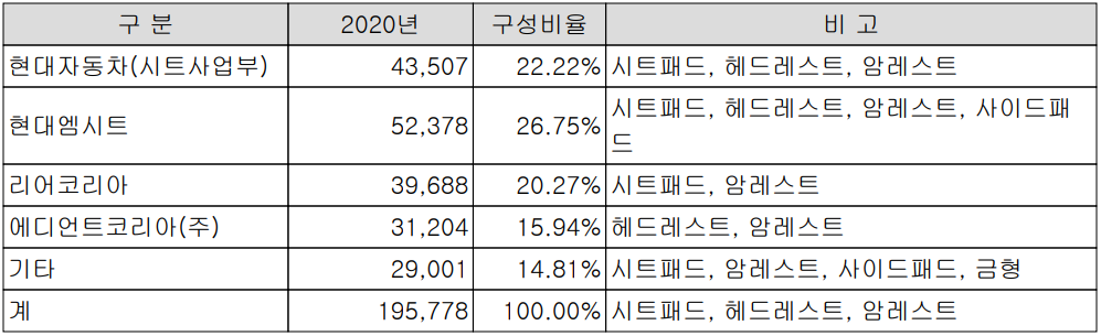 2. 현대자동차 암레스트의 78%, 시트패드 28% 납품 등 확고한 매출원 확보