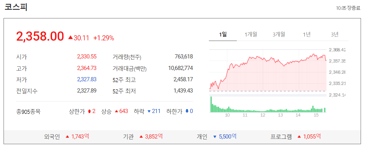 지난 주에 이어 오늘도 기관의 매수세가 늘어나면서 코스피는 전 거래일 대비 30.11포인트(1.29%) 오른 2358.00에 마감했습니다. 장 시작은 강보합으로 출발하였으나 장중에 나온 트럼프 미국 대통령의 코로나19 병세가 심하지 않다는 뉴스에 시간이 지남에 따라 상승흐름을 탔습니다. 오늘 수급은 개인이 5500억 원 순매도하는 가운데 기관과 외국인이 각각 3852억 원, 1743억 원어치 순매수에 나서면서 상승을 이끌었습니다. 특히 현대차, 기아차, 포스코 및 카카오 등은 기관과 외국인의 동시 순매수를 기록하면서 강한 상승을 보였습니다. 특히 외국인은 LG화학을 473억 원 순매수했습니다.