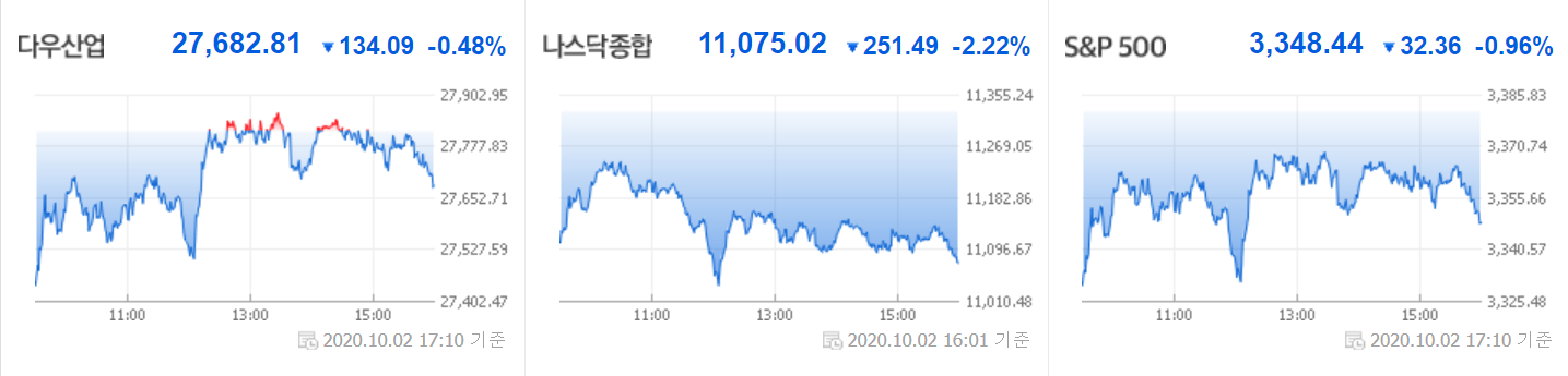 지난 금요일 뉴욕 증시는 미국 추가 경기 부양 안에 대한 불확실성과 트럼프 미국 대통령의 코로나19 확진에 대한 이슈로 특히 나스닥이 2.22% 하락한 11075.02로 마감했습니다.
