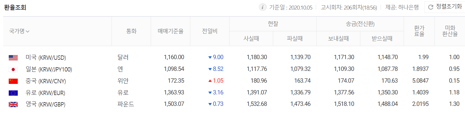 오늘 원달러 환율은 전 거래일 대비 9원 하락한 1160.00 원에 마감했습니다. 전체적으로는 아시아 시장에서 달러 약세로 전환한 듯한 흐름입니다.단지, 트럼프 대통령의 코로나19 확진 발표 순간 달러 강세 모습을 봈지만 일시적이라는 분석이 많습니다.